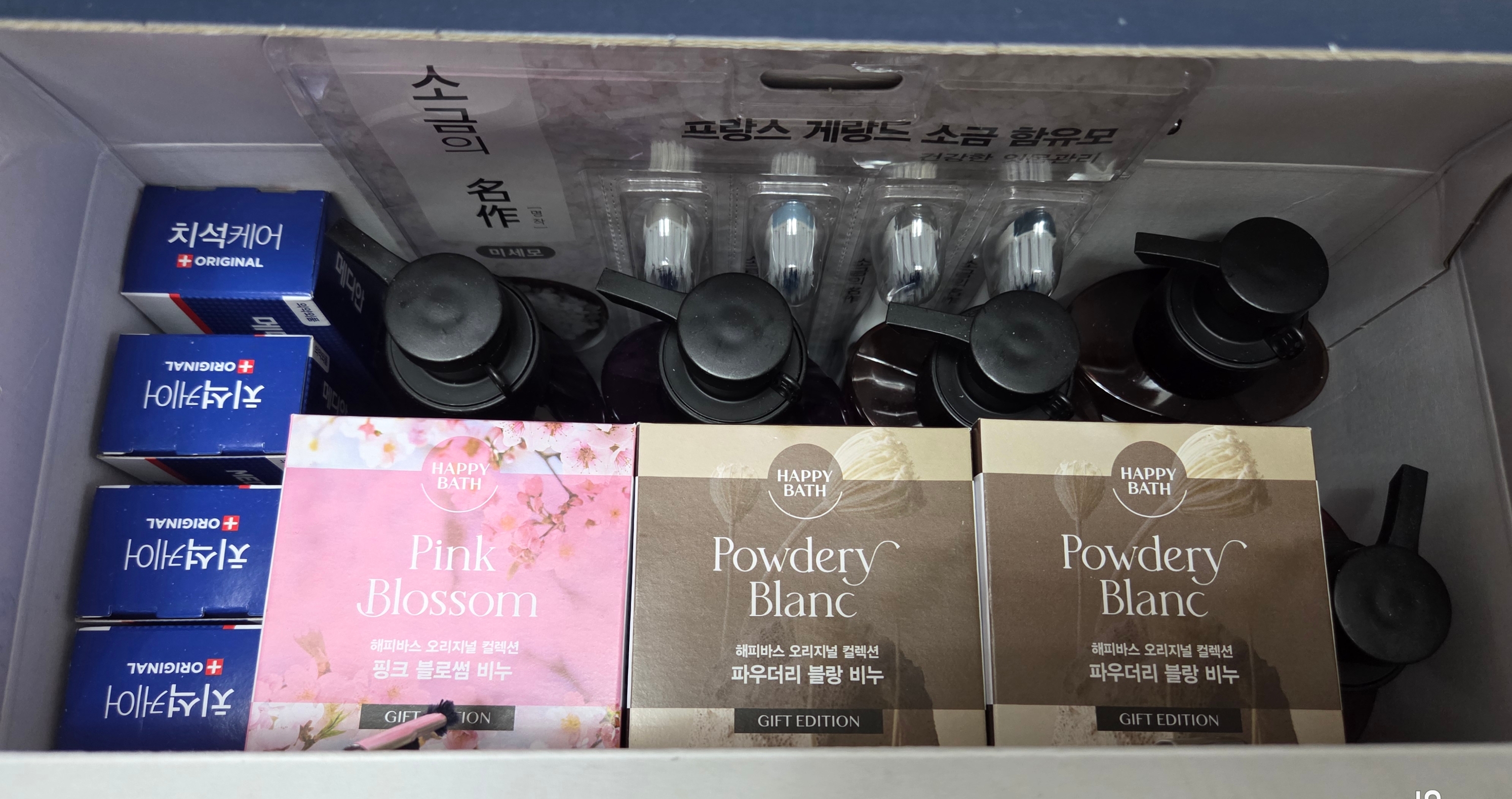 칫솔4개 치약4개 비누3개 샴푸5개 바디워시 3개로